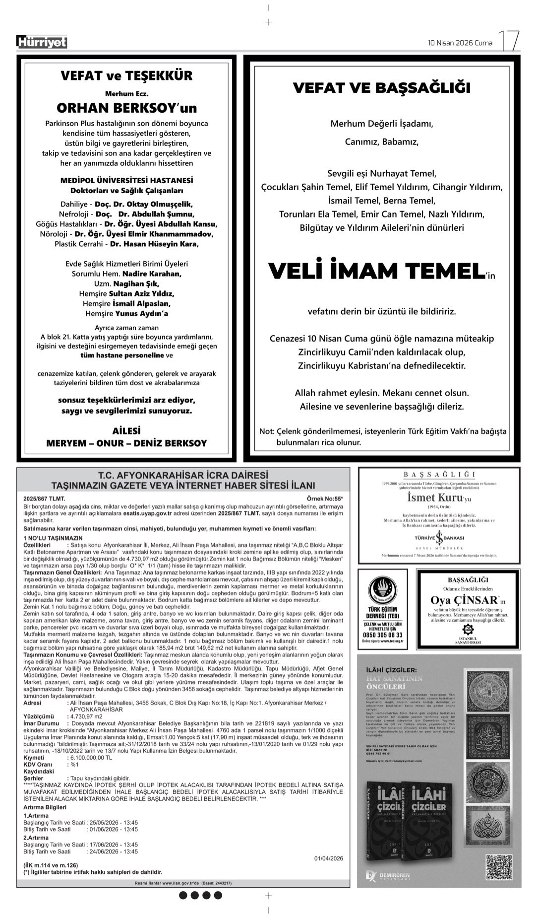 10 Nisan 2026 Hürriyet Gazetesi vefat, başsağlığı ve anma ilanları.