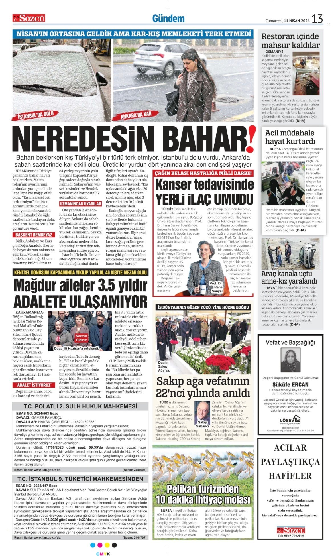 11 Nisan 2026 Sözcü Gazetesi vefat, başsağlığı ve anma ilanları.