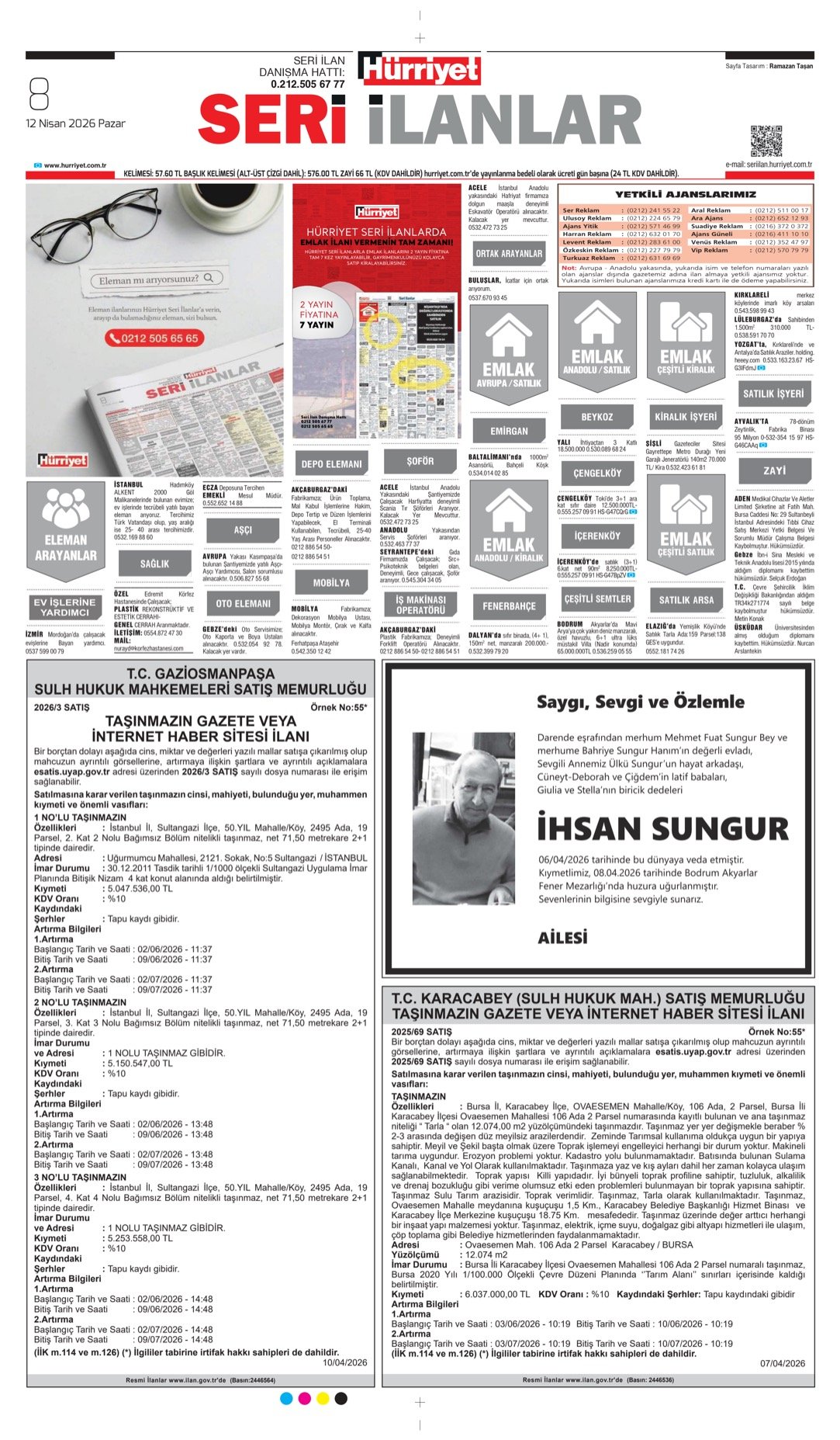 Hürriyet Gazetesi vefat ilanı vermek için 7/24 hizmetinizdeyiz: 0533 504 01 01