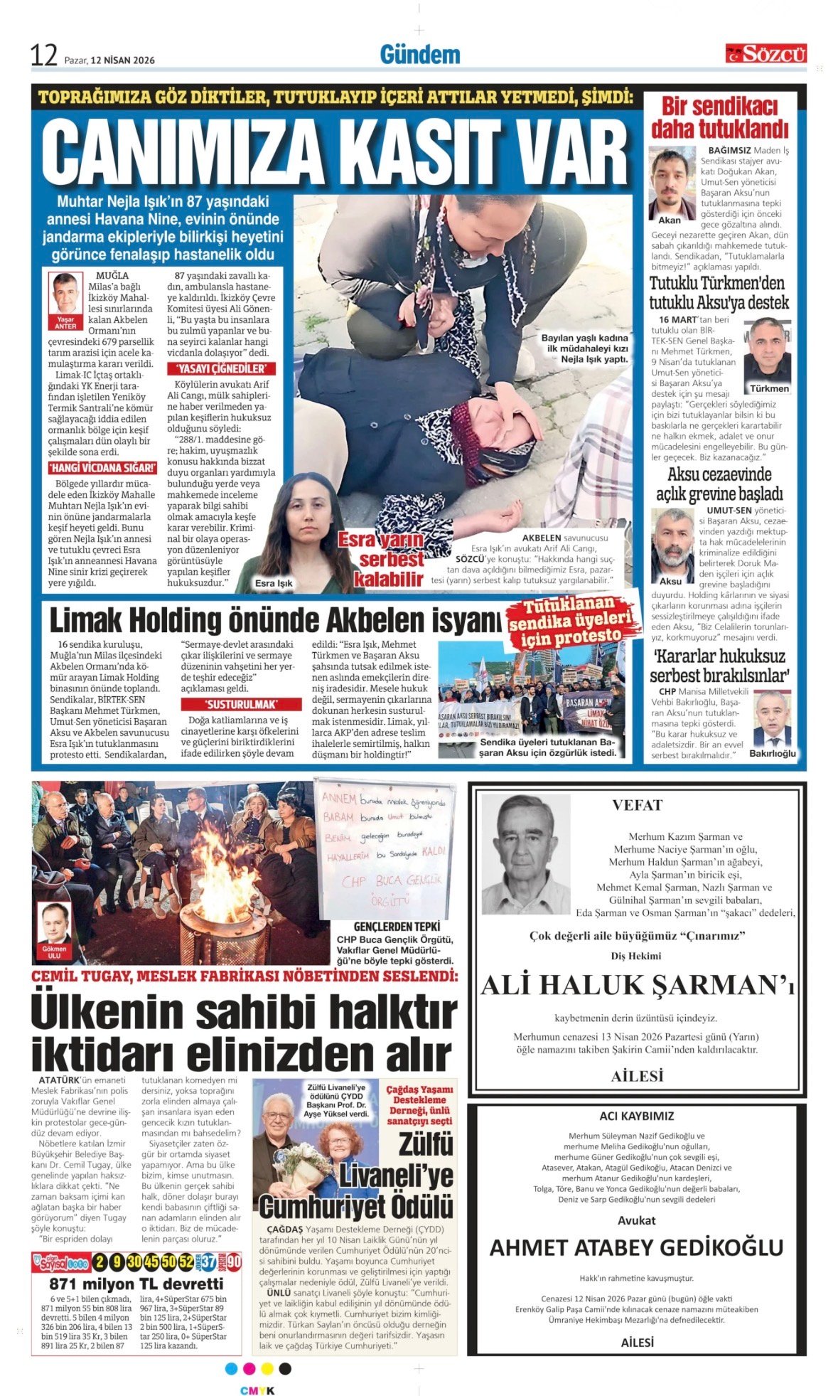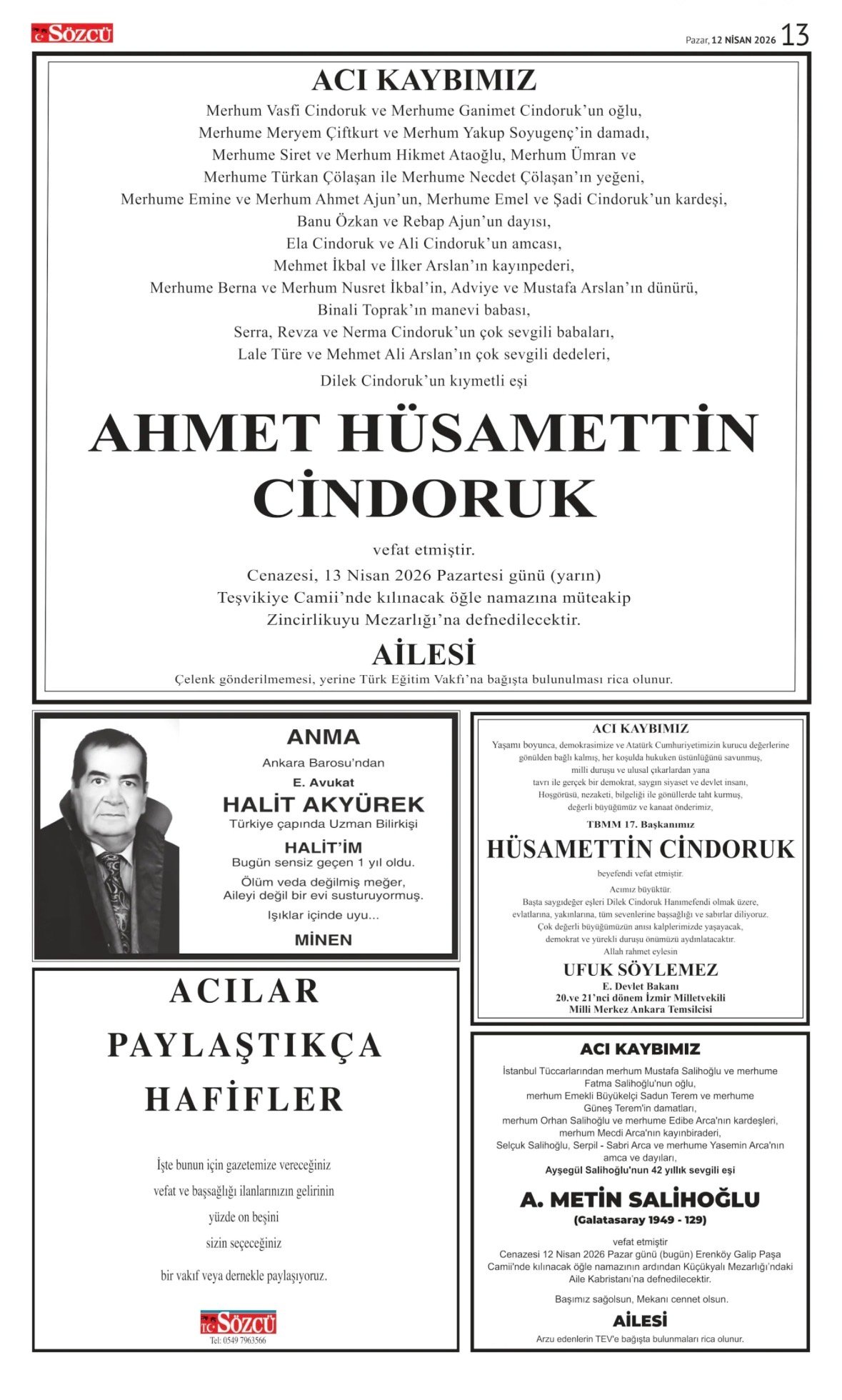 12 Nisan 2026 tarihli Sözcü Gazetesi vefat, başsağlığı ve anma ilanları. İstanbul, Ankara, İzmir ve Adana baskılarında yer alan ilanlar yayınlanmaktadır.📌 Bağış: Sözcü Gazetesi vefat ilanı ve başsağlığı ilanı verdiğinizde ödemenizin %15'ini "