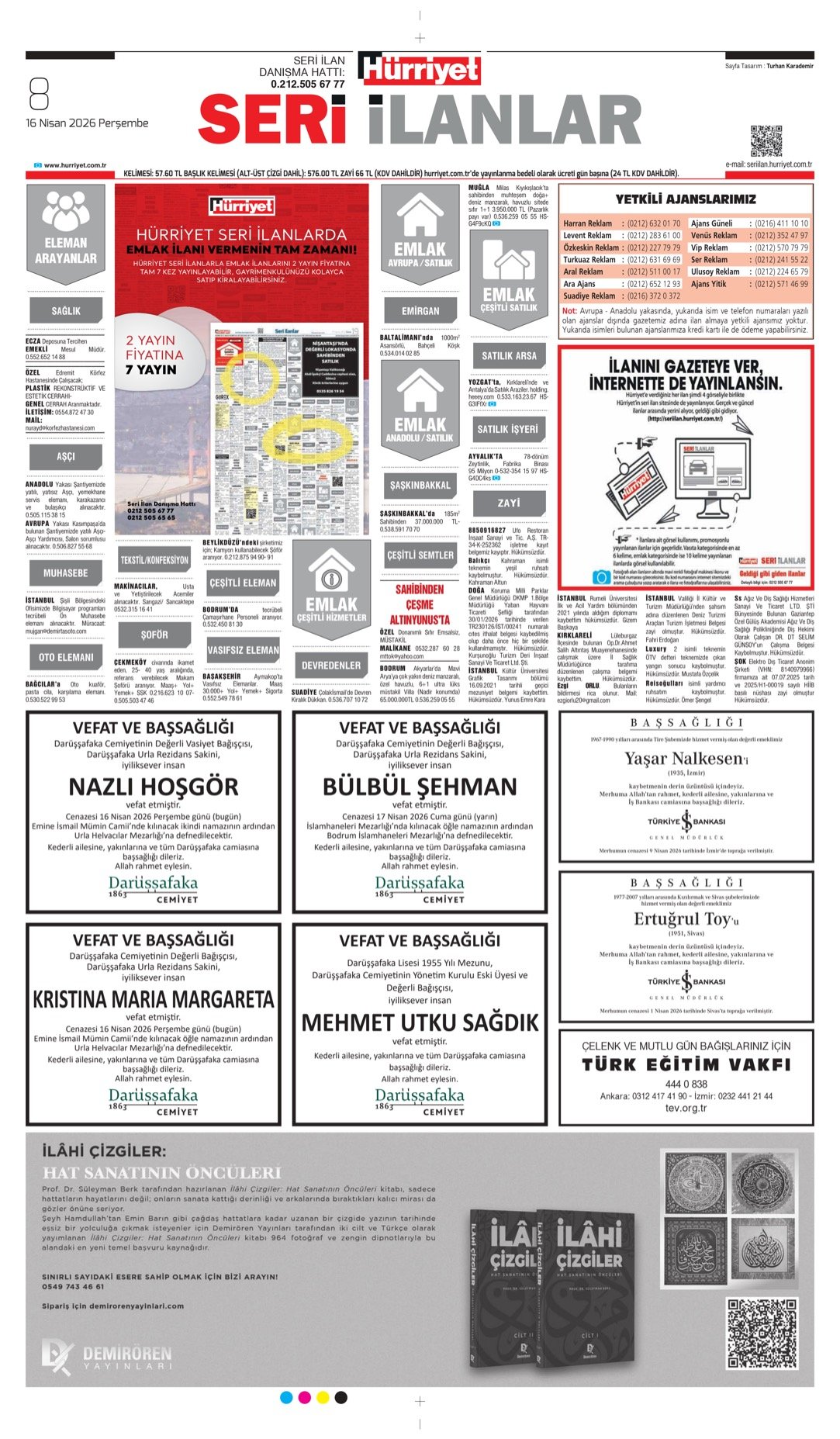 16 Nisan 2026 Hürriyet Gazetesi vefat, başsağlığı ve anma ilanları.