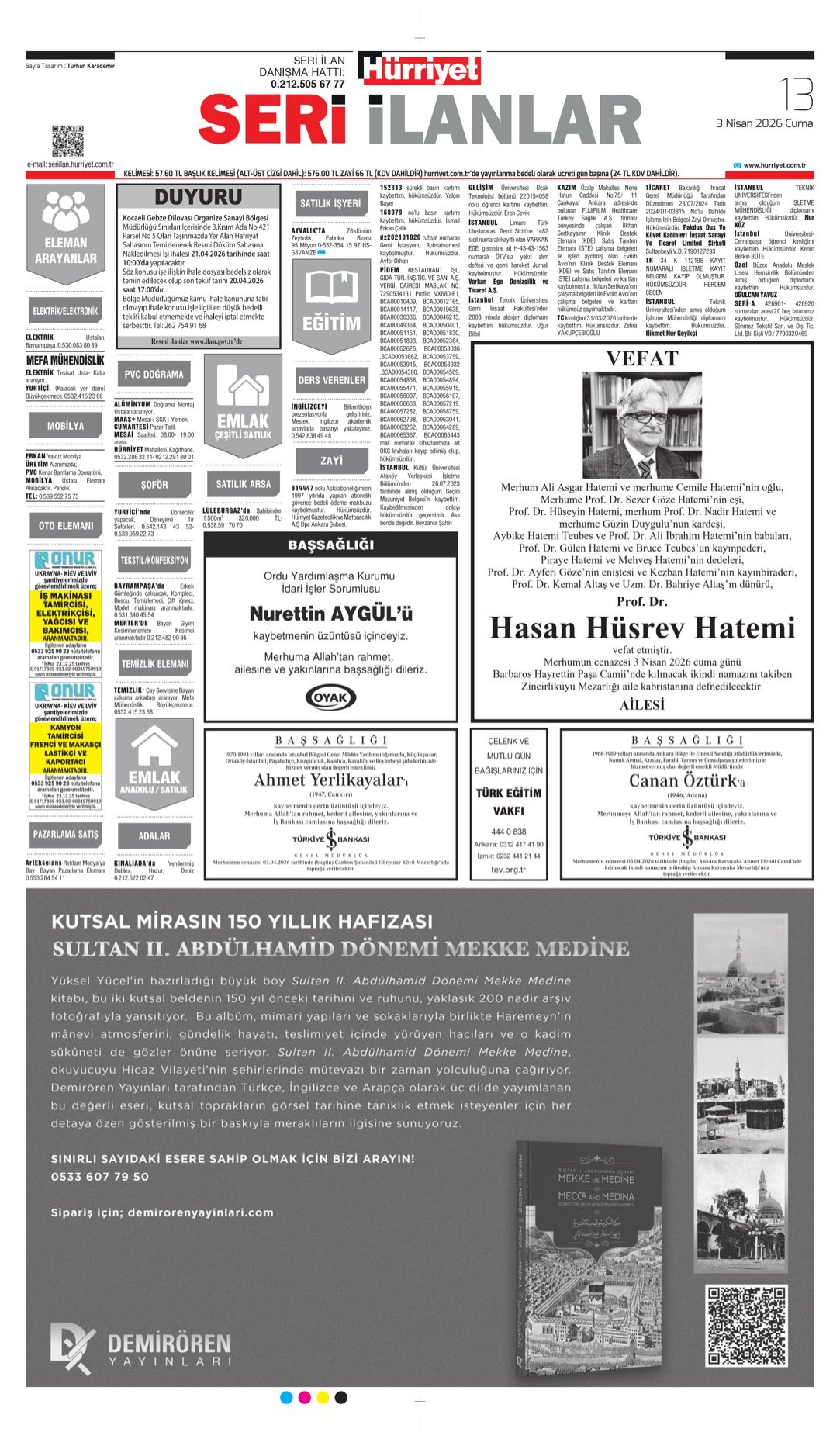 3 Nisan 2026 Hürriyet Gazetesi vefat, başsağlığı ve anma ilanları.