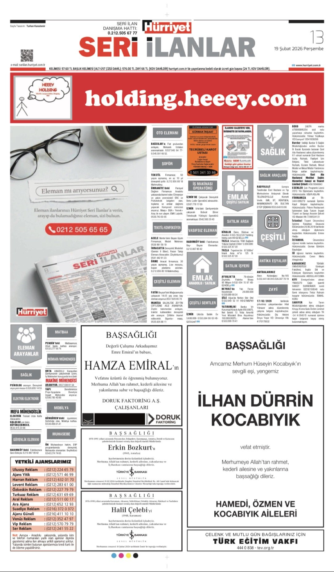 Hürriyet Gazetesi Vefat İlanı Ver | 7/24 HizmetHARUN OKUMUŞ, MÜCAHİT YILMAZ, İSMAİL PEKTAŞ, ZEKİ ÇAKIROĞLU, VAHTİ AKYOL, MEHMET ERMİŞ, …