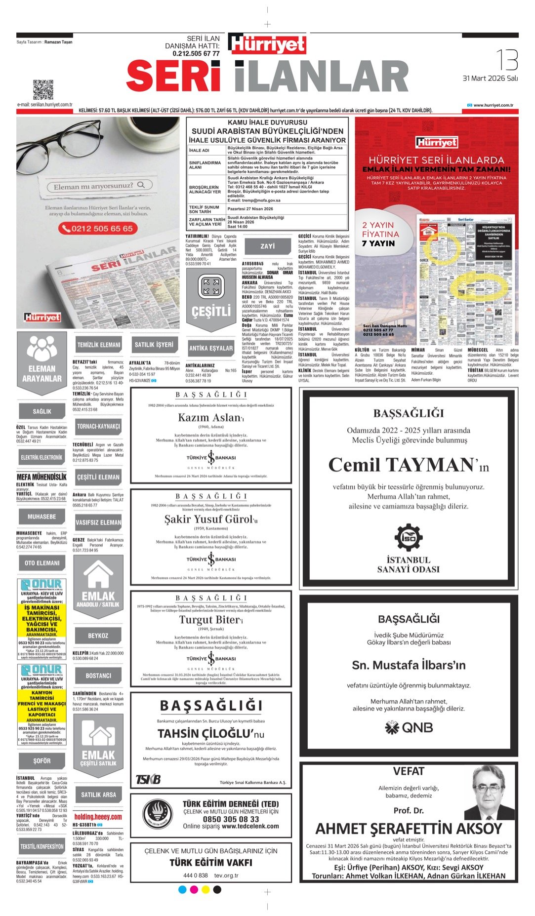 Hürriyet Gazetesi Vefat İlanı Ver | 7/24 HizmetEKREM SAATÇİ, AHMET SÖYLEMEZ,26 Mart 2026-Hürriyet Bugünkü Vefat (Ölüm) – Başsağlığı –…