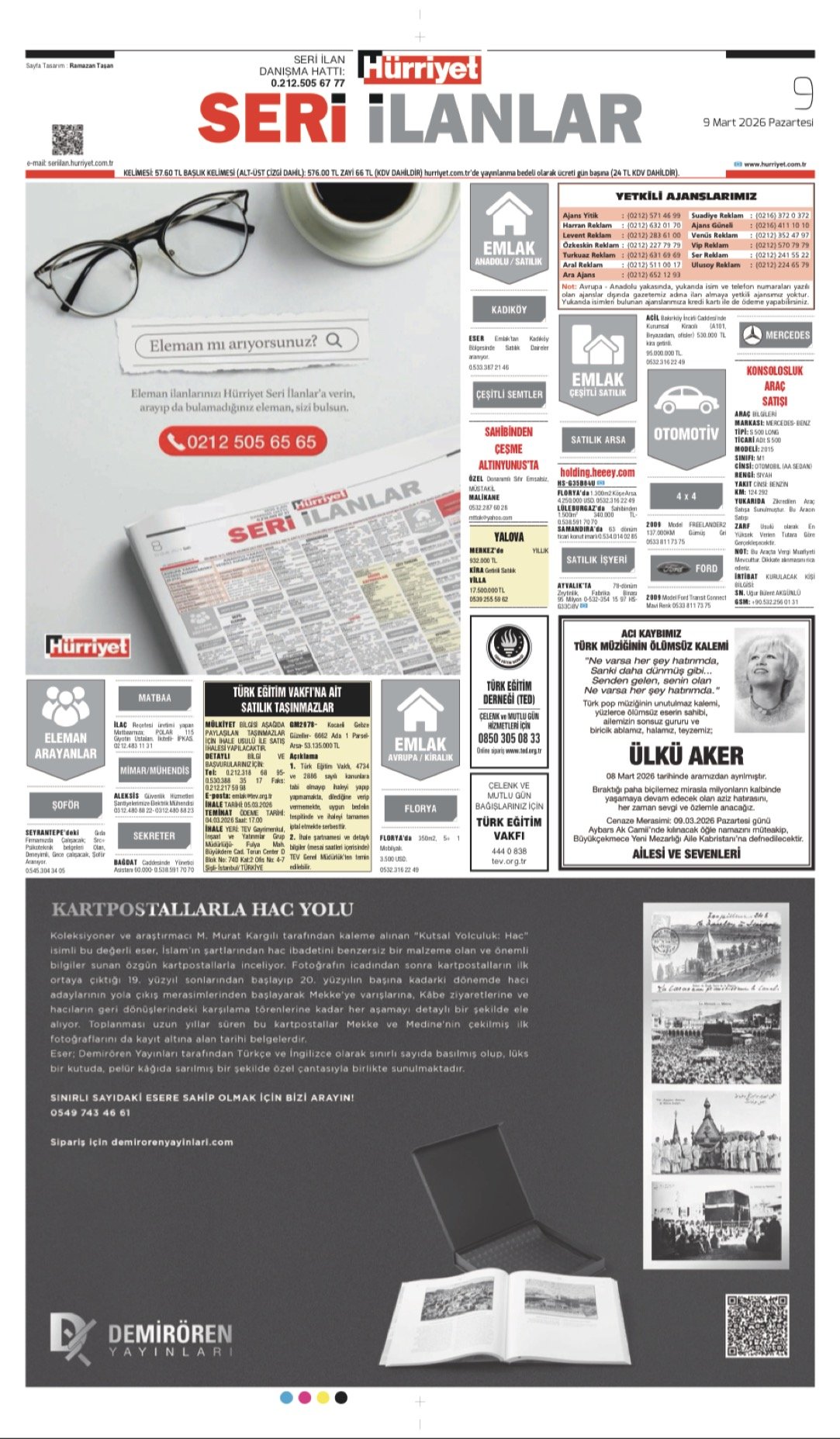 Hürriyet Bugünkü Vefat İlanlar;ÜLKÜ AKER,Hürriyet Bugünkü Vefat (Ölüm) – Başsağlığı – Anma – Teşekkür – Mevlit İlanları-9.3.2026 …