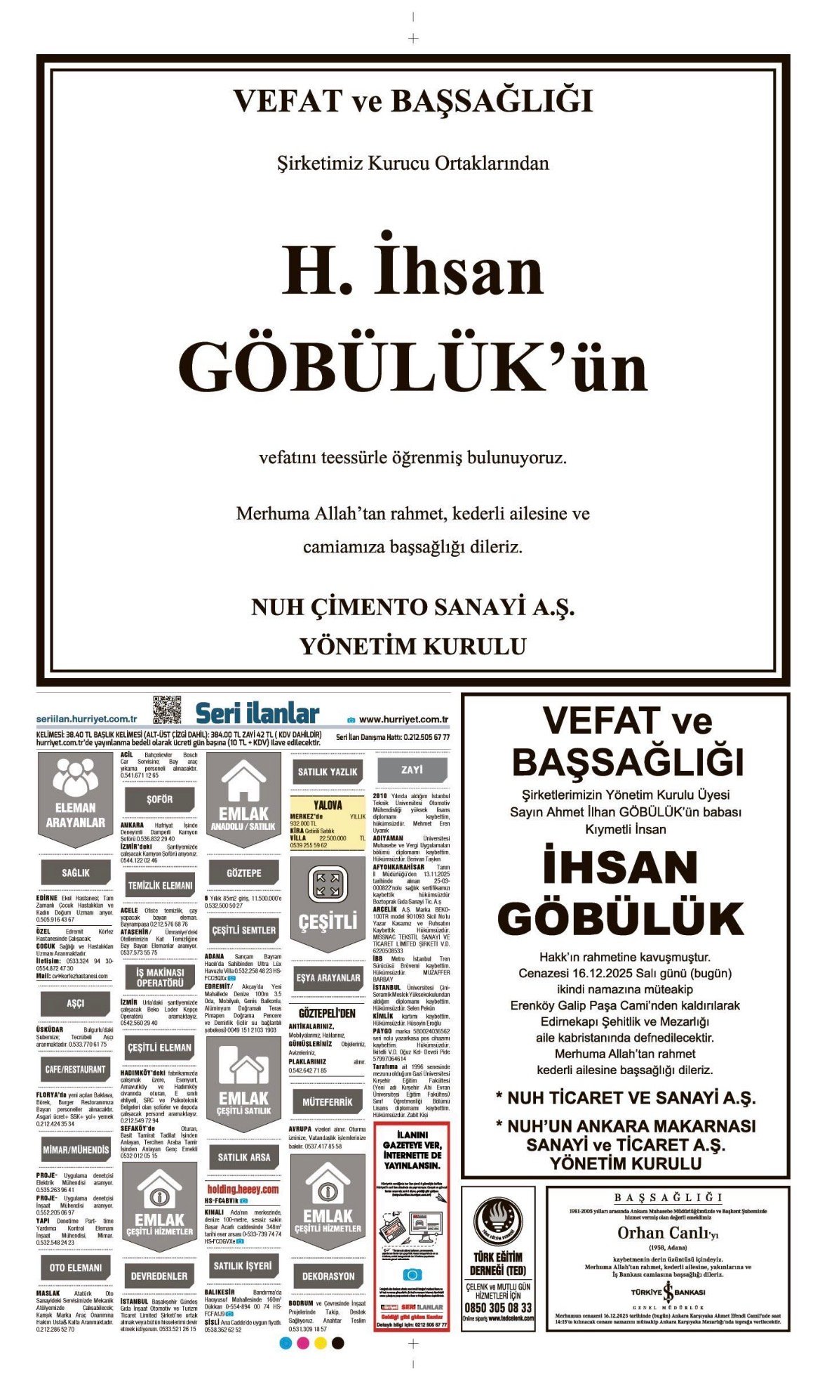 Hürriyet Bugünkü Vefat (Ölüm) – Başsağlığı – Anma – Teşekkür – Mevlit İlanları-6.12.2025 SABAHATTİN GÜLÇELİK - VEFAT ANMA İLANI, SEVİNÇ ULUTAŞ…