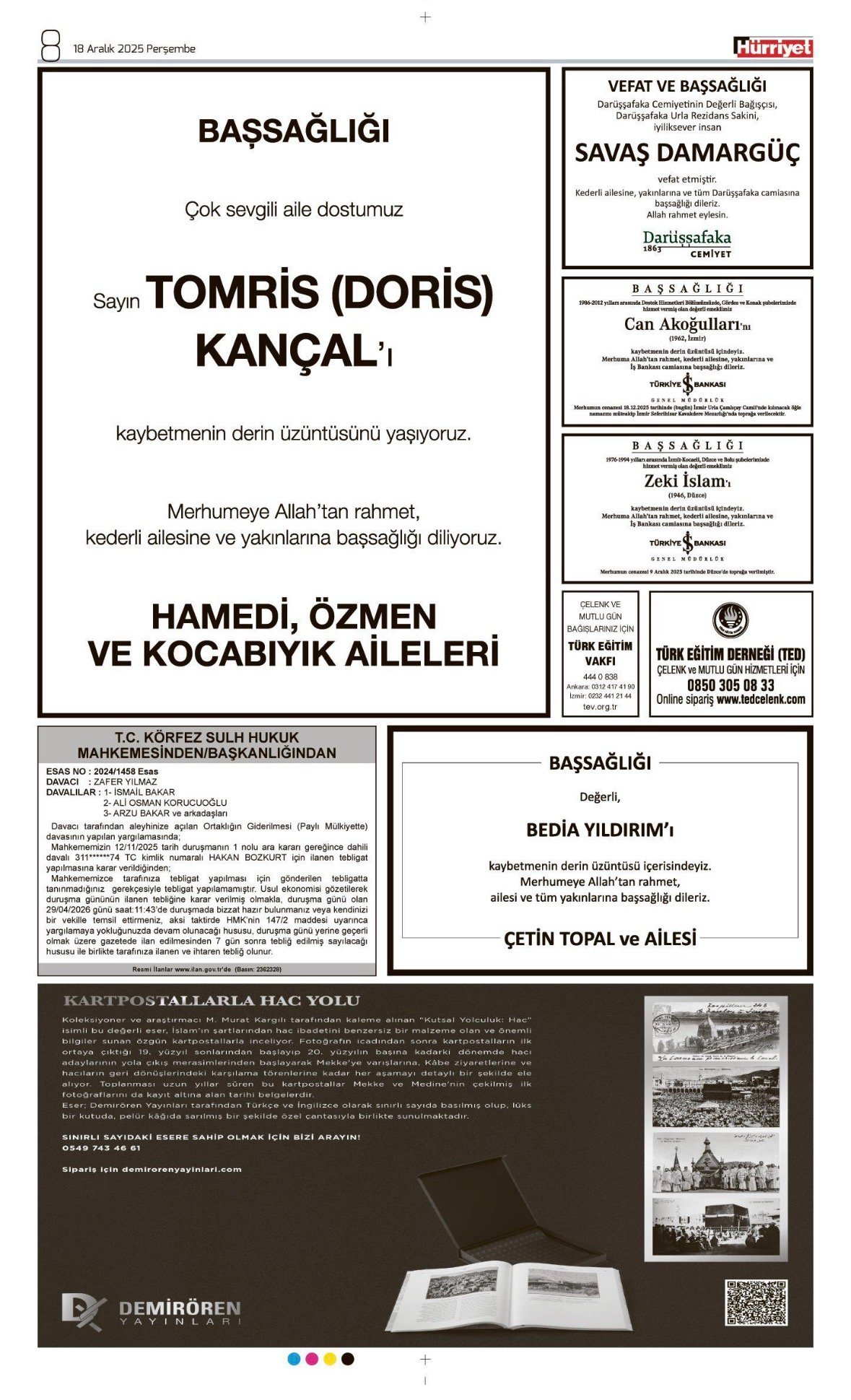 Hürriyet Bugünkü Vefat (Ölüm) – Başsağlığı – Anma – Teşekkür – Mevlit İlanları-18.12.2025