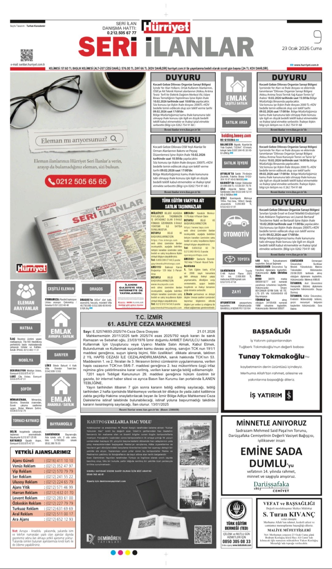 Hürriyet Bugünkü Vefat (Ölüm) – Başsağlığı – Anma – Teşekkür – Mevlit İlanları-23.1.2026