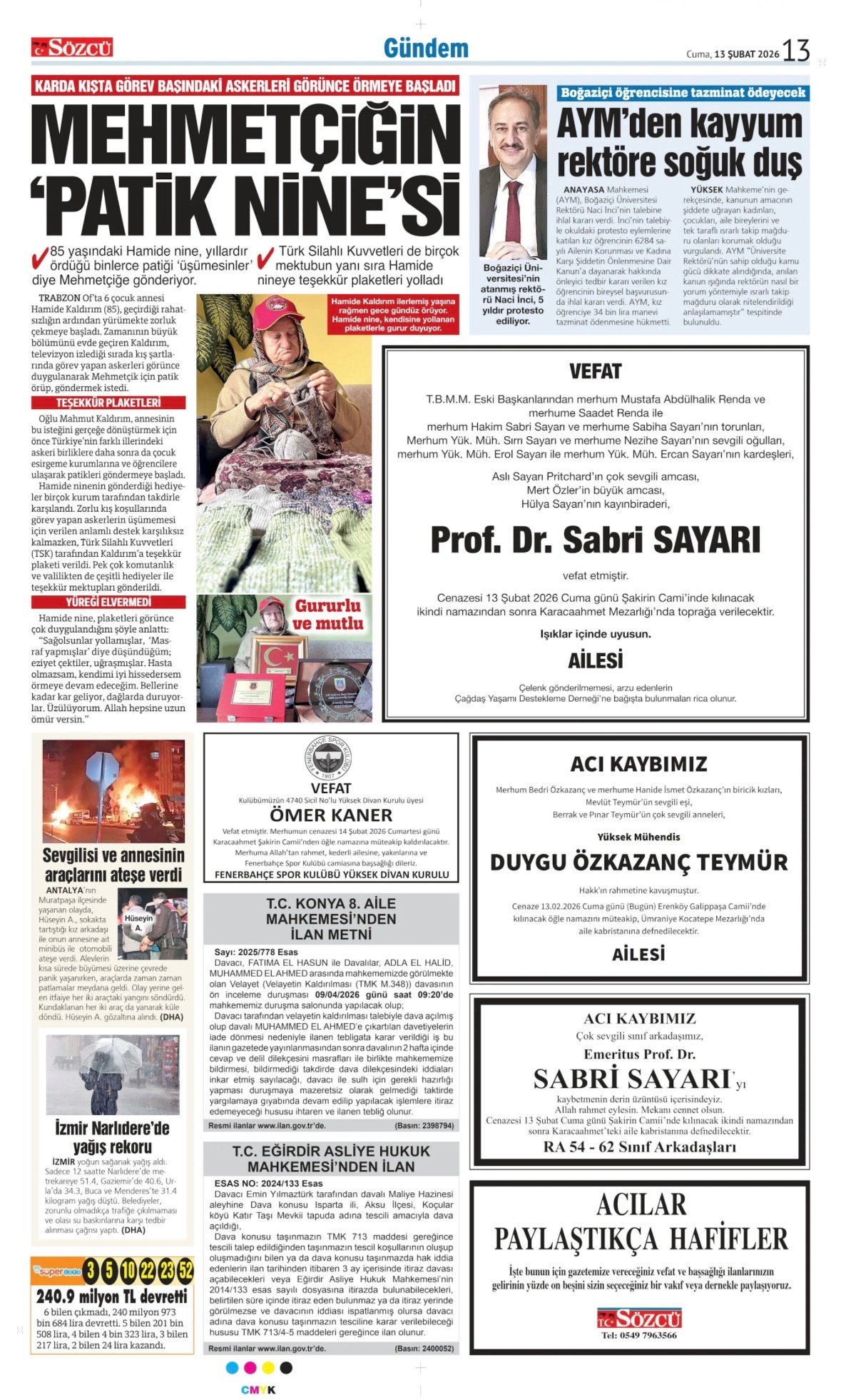 Sözcü Bugünkü Vefat İlan- Başsağlığı İlanı- Anma İlanları ve Arşiv Sayfalar. 13.2.2026