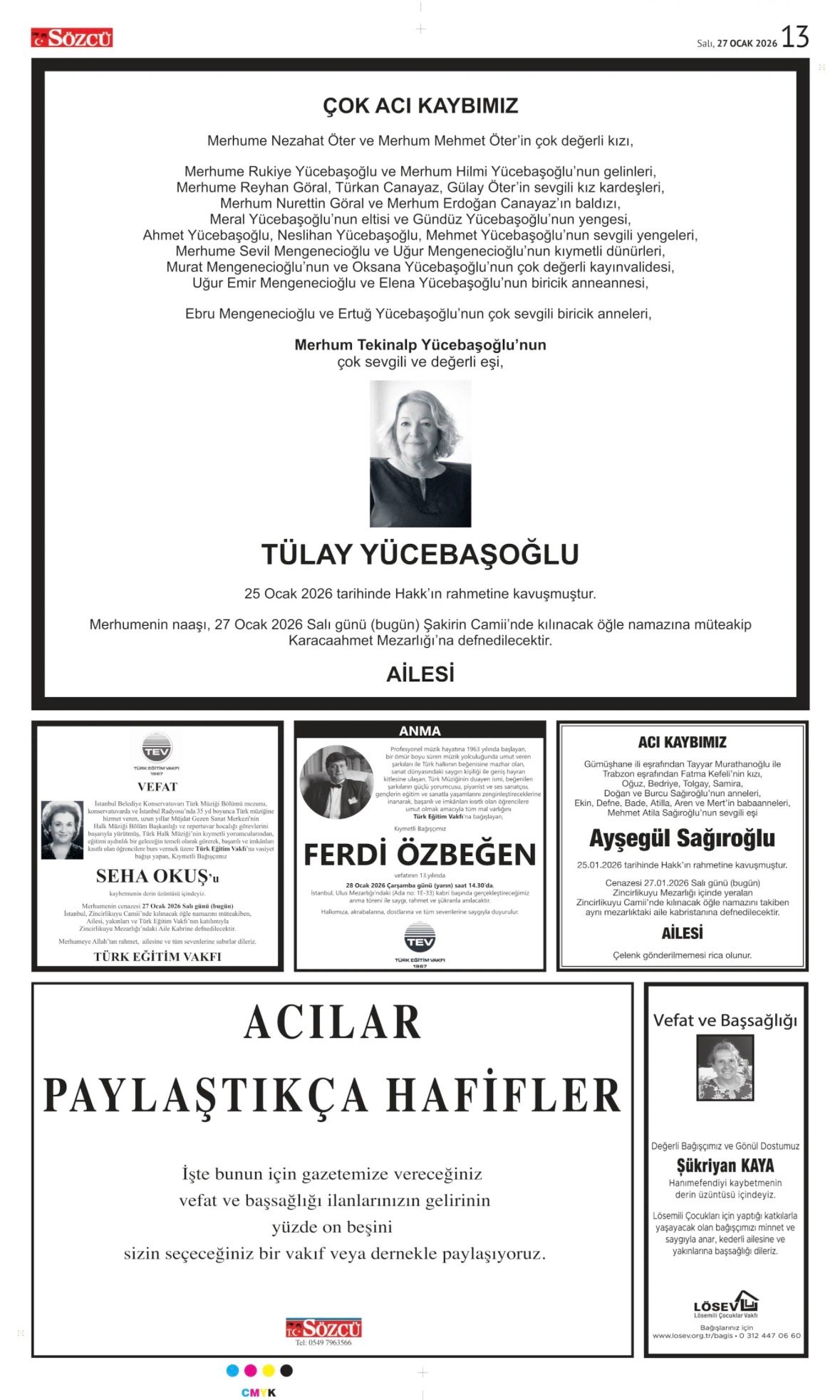 Sözcü Bugünkü Vefat İlan- Başsağlığı İlanı- Anma İlanları ve Arşiv Sayfalar. 27.1.2026