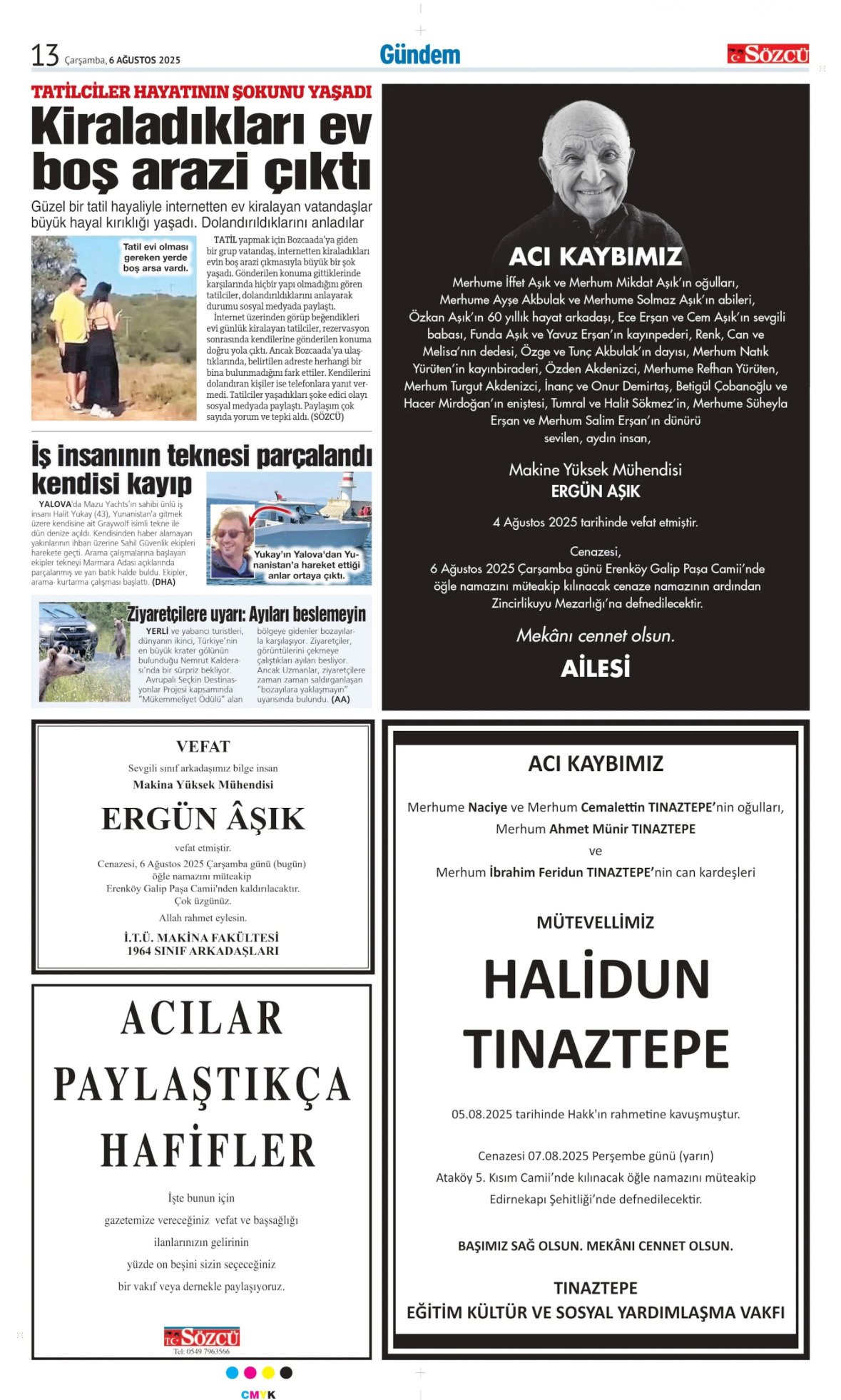 Sözcü Bugünkü Vefat İlanlar 6.8.2025;