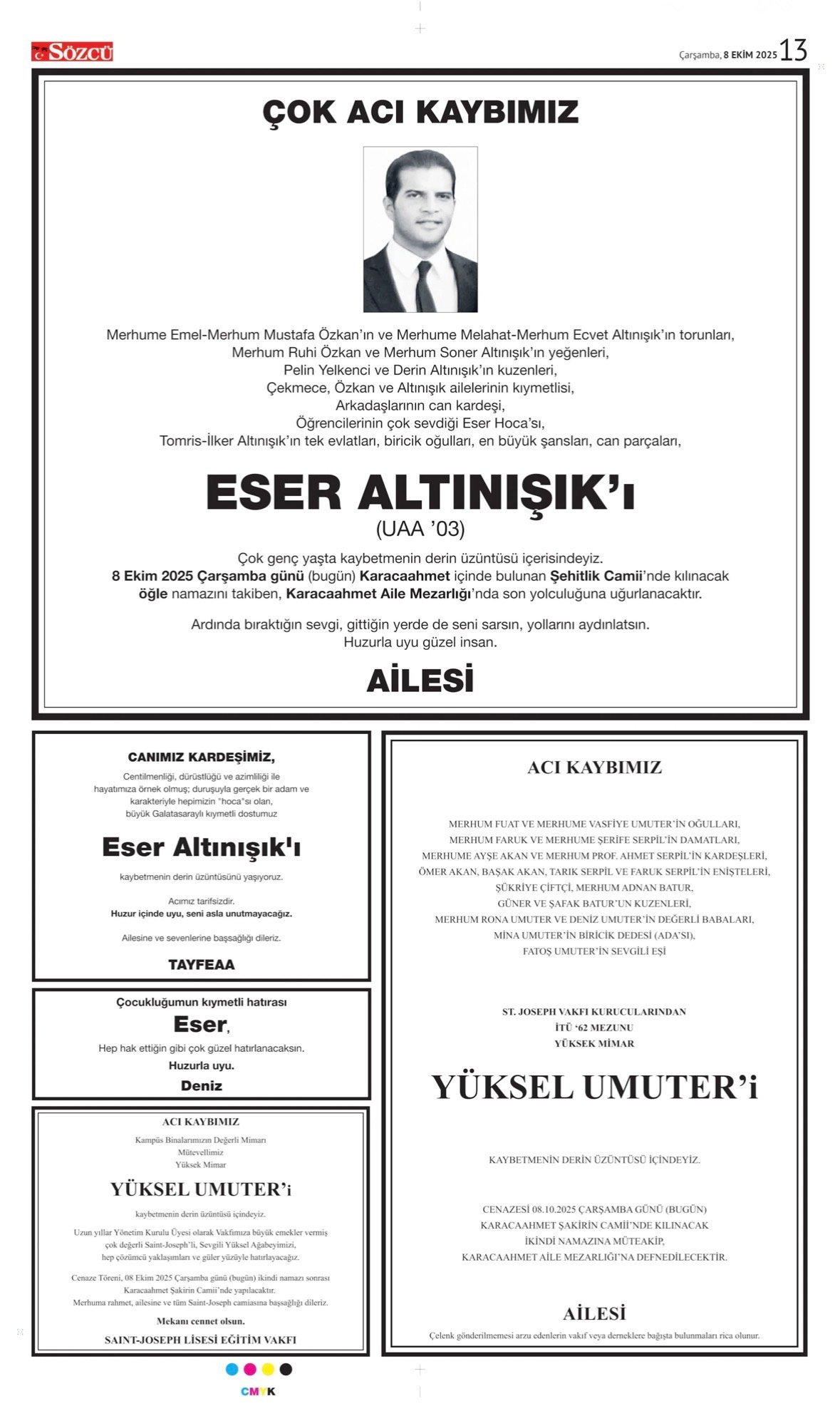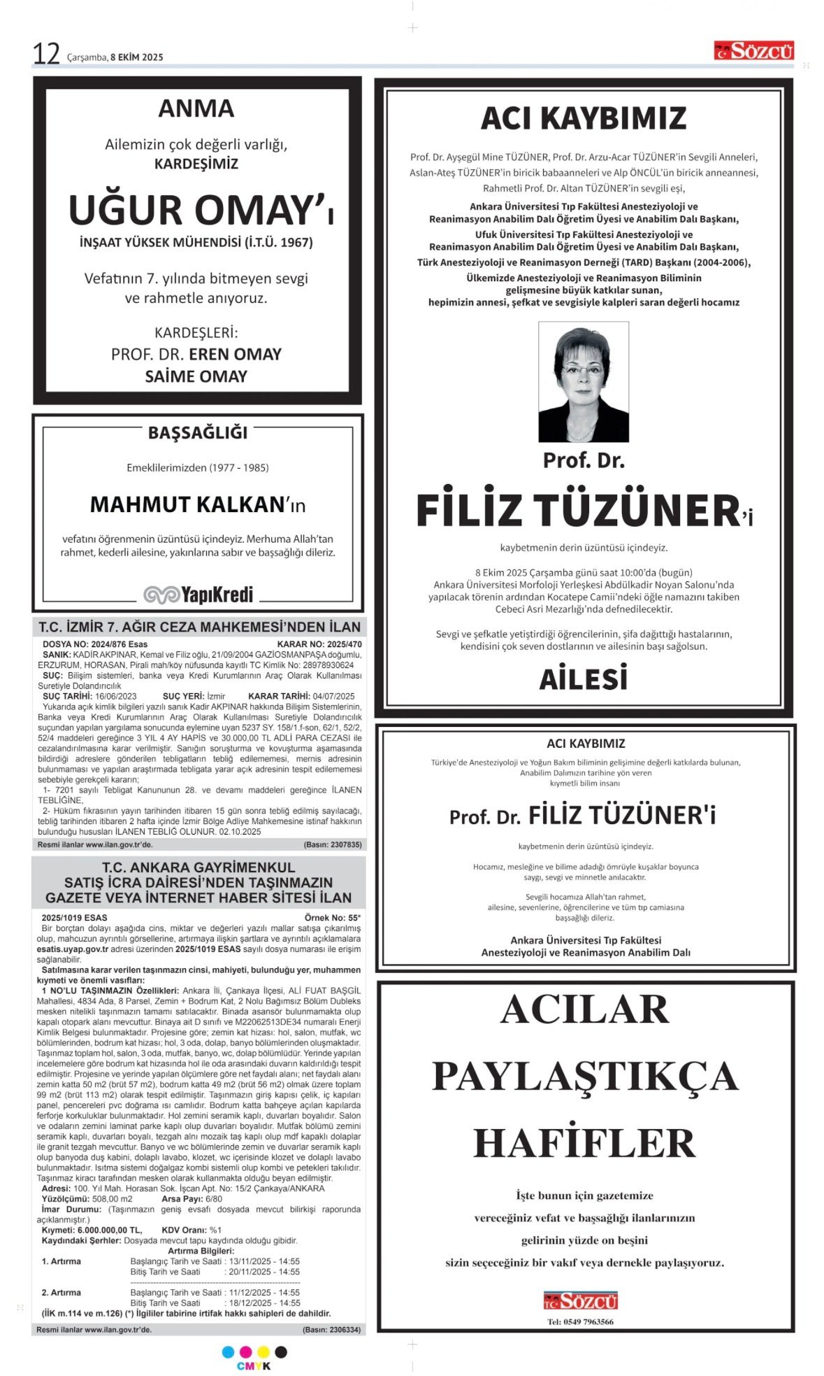 Sözcü Bugünkü Vefat, Başsağlığı, Anma İlanları 8.10.2025;